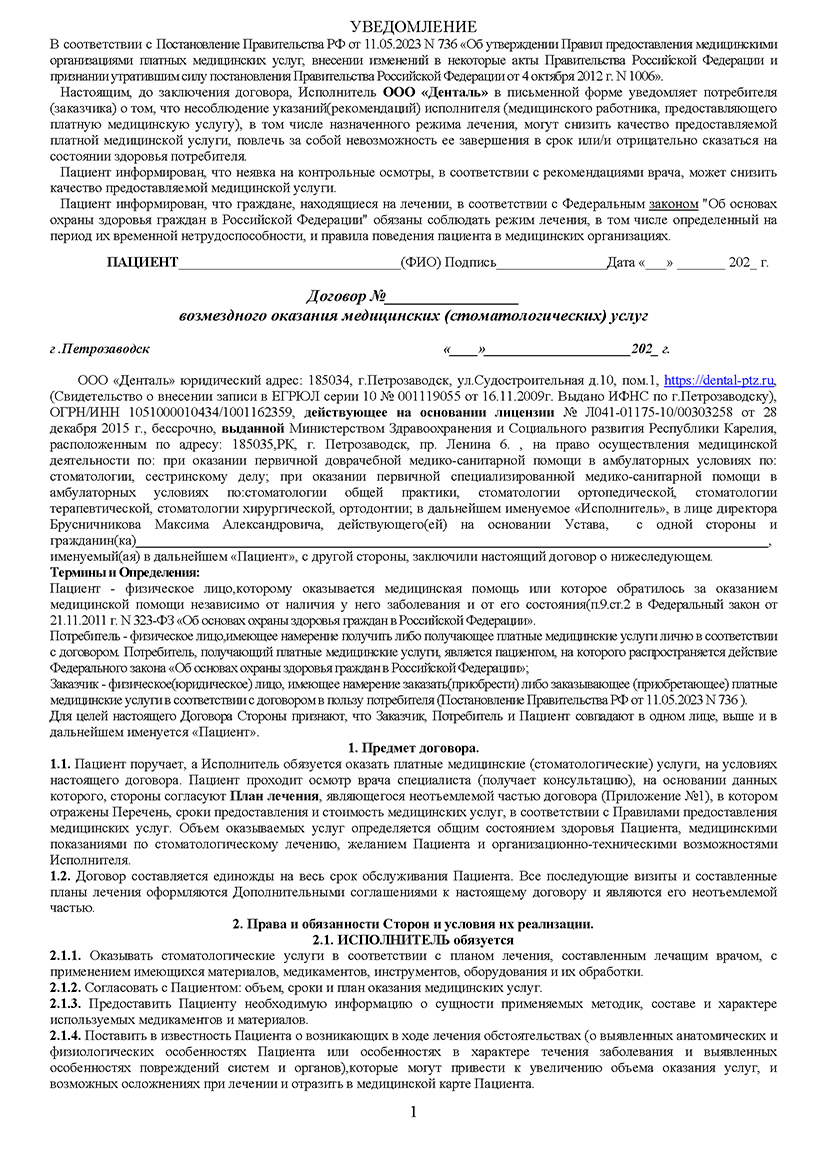 ООО «Денталь» не осуществляет бесплатного оказания гражданам медицинской помощи.