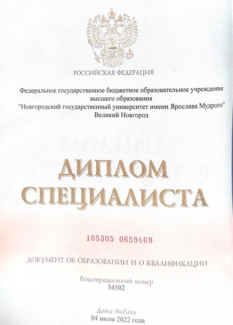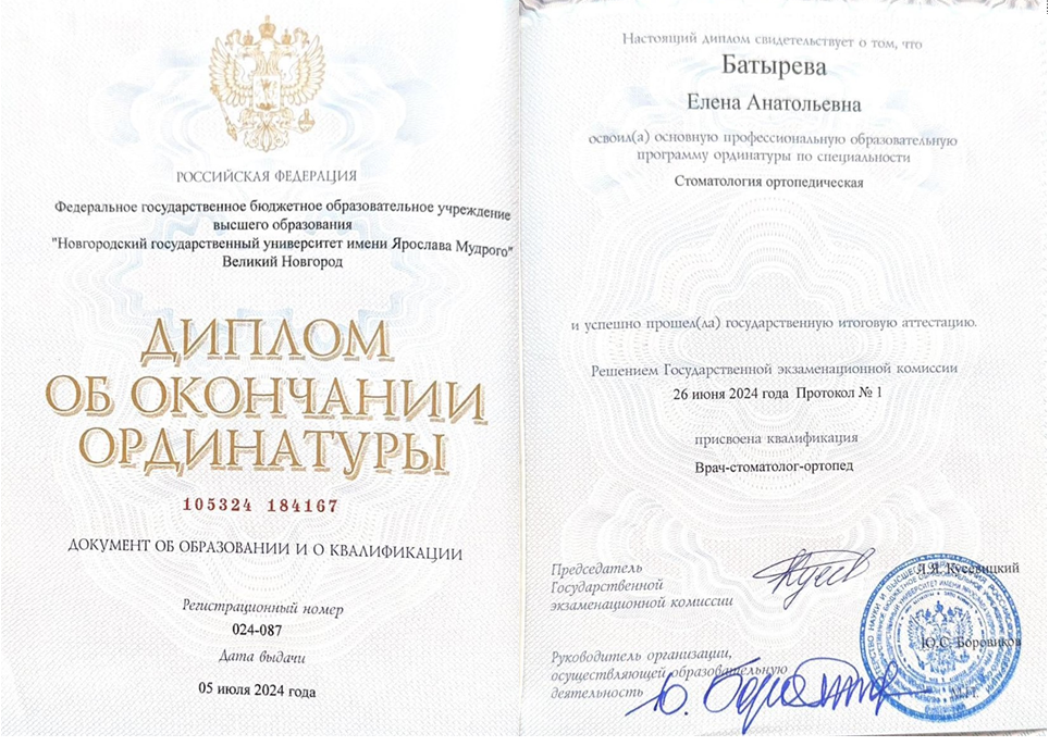 2024 г. — ординатура по специальности «Стоматология ортопедическая», Новгородский государственный университет им. Ярослава Мудрого.