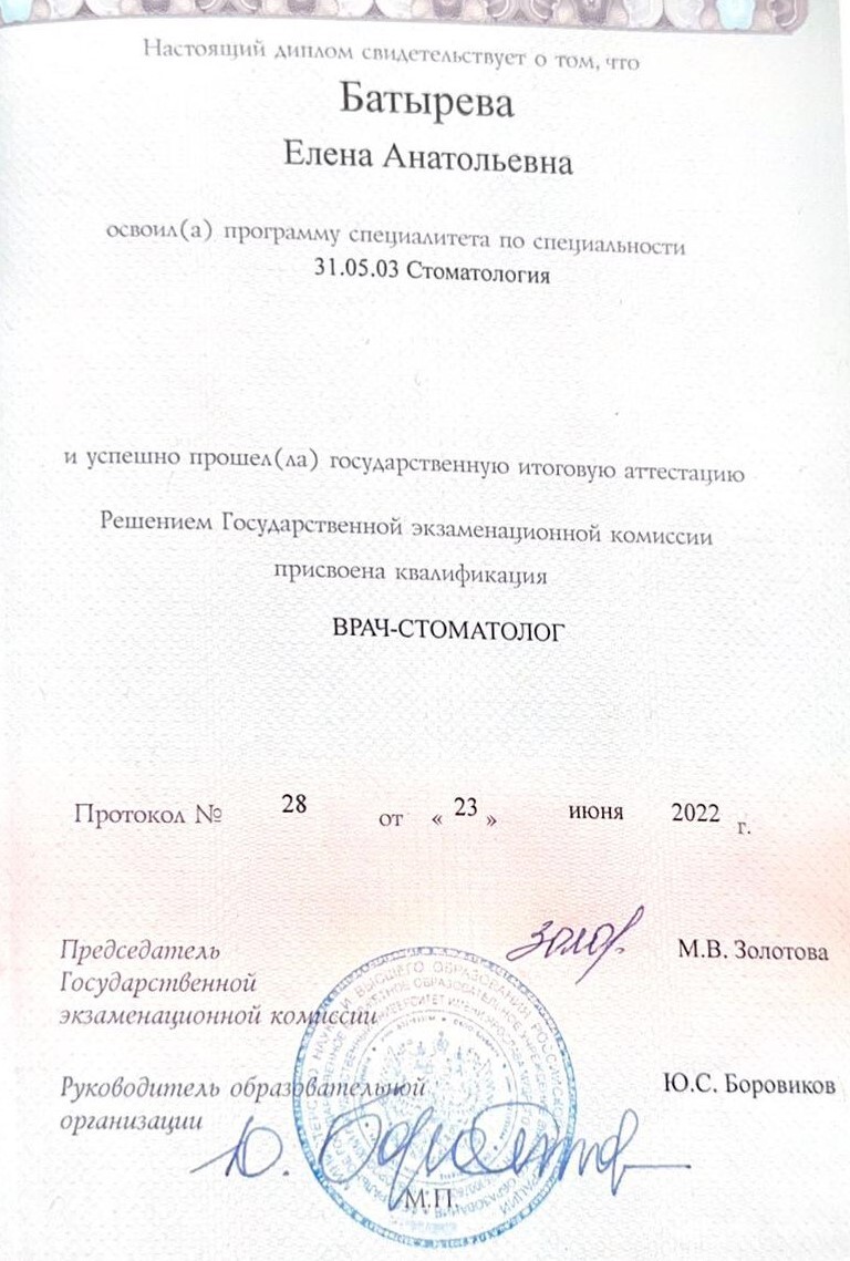 2024 г. — ординатура по специальности «Стоматология ортопедическая», Новгородский государственный университет им. Ярослава Мудрого.