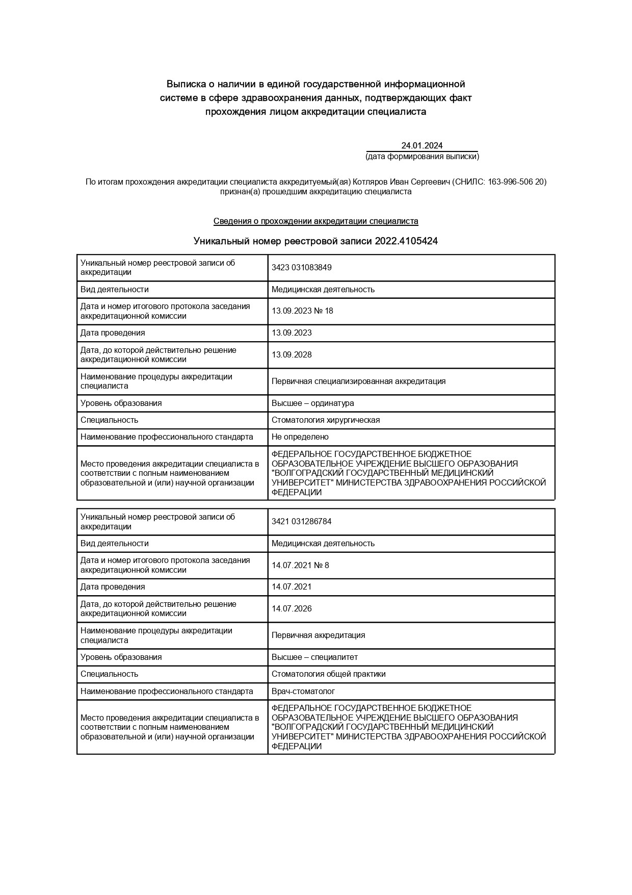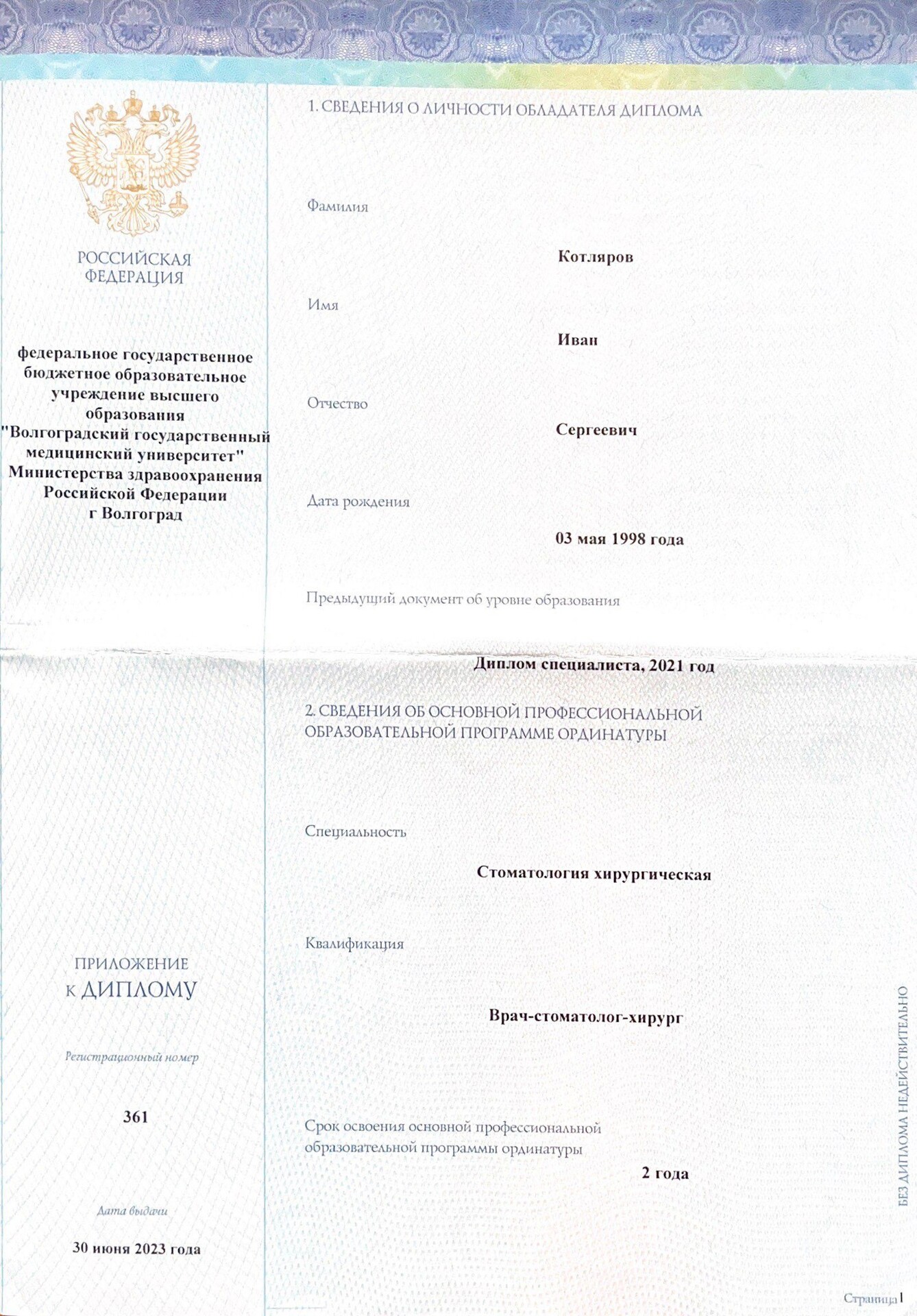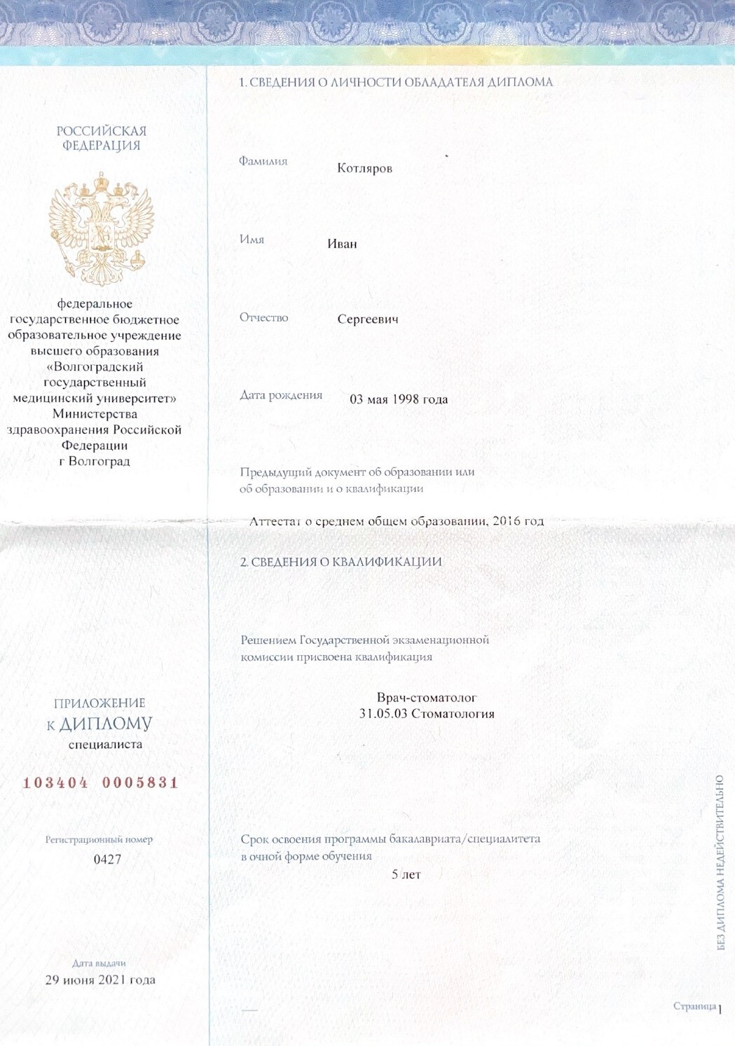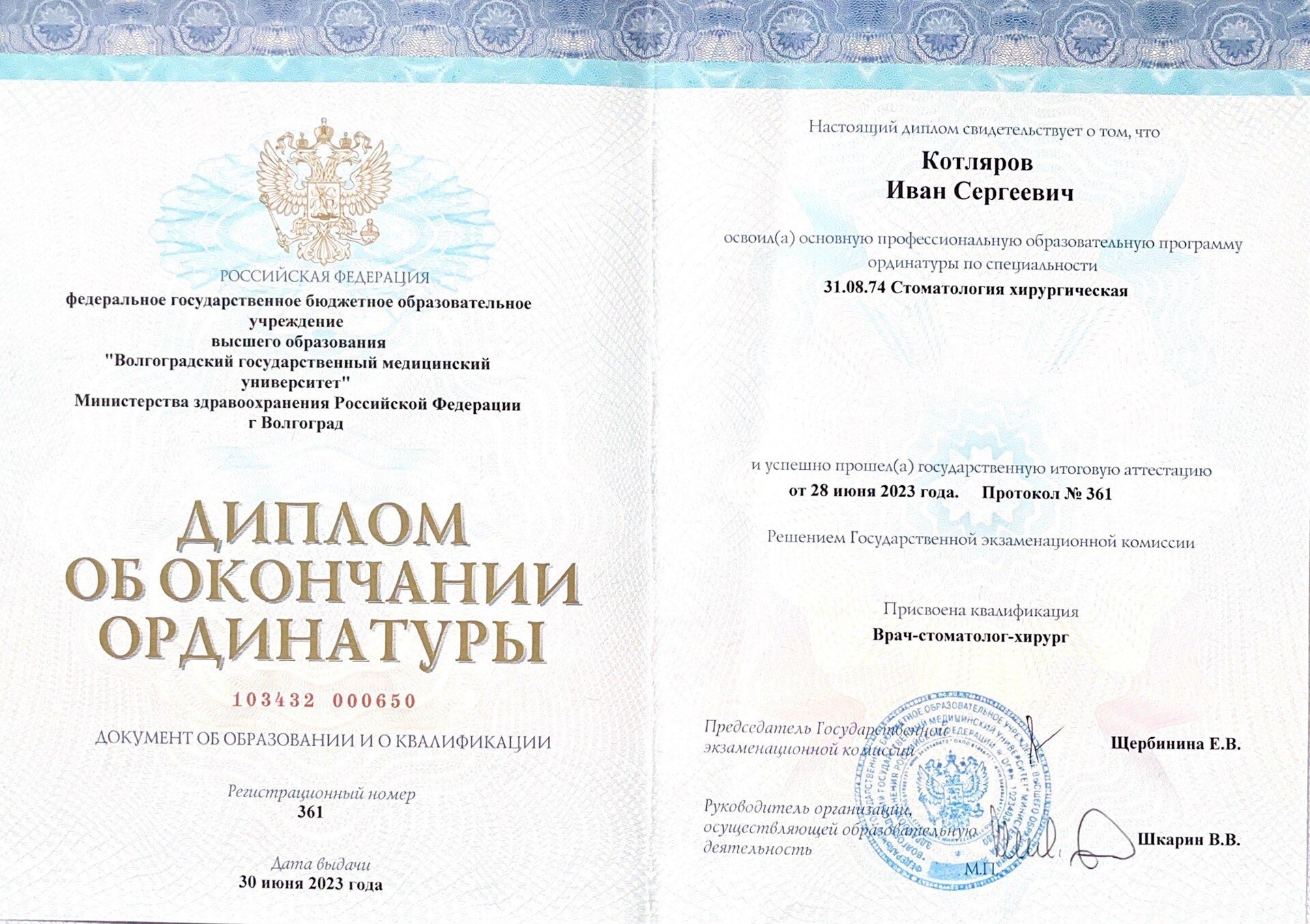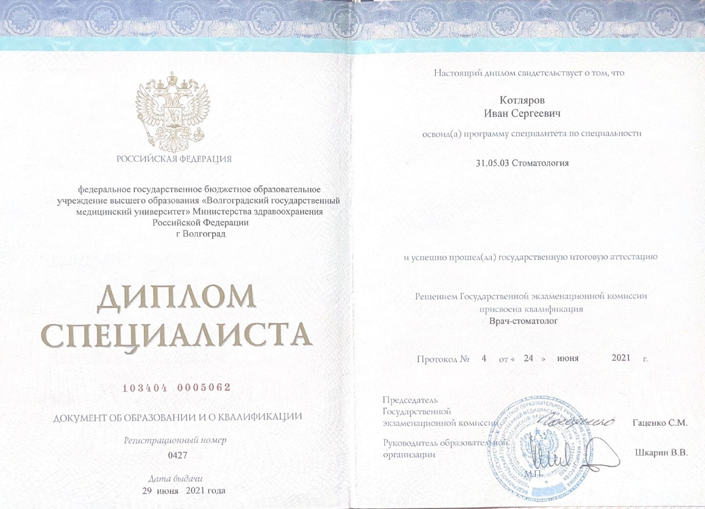 Окончил ФГБОУ ВО "Волгоградский государственный медицинский университет" Министерства здравоохранения РФ г.Волгоград в 2021 году