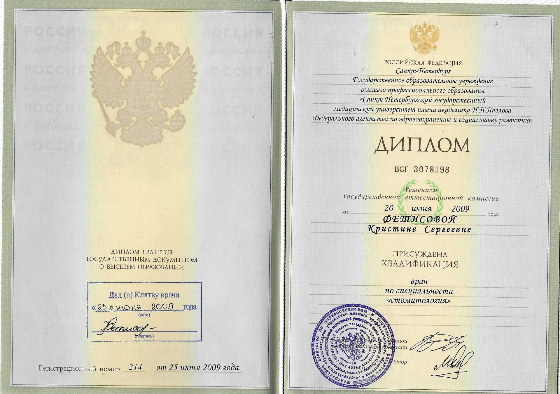 Окончила ФГБОУ ВО "Первый Санкт-Петербургский государственный медицинский университет им. Академика И.П.Павлова" Министерства здравоохранения РФ Санкт-Петербург в 2009 году